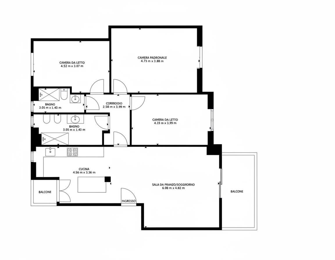 Zona notte: 2 camere matrimoniali, 1 camera doppia e doppi servizi finestrati con doccia.